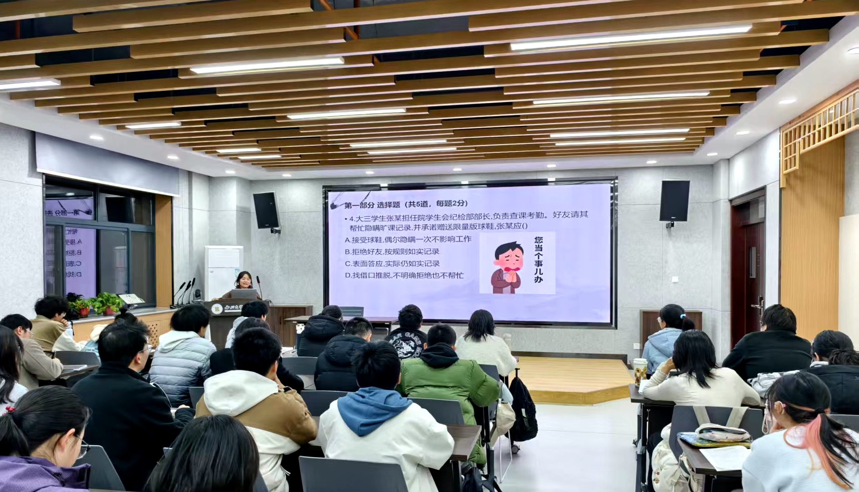 在知识竞赛环节,大家踊跃发言,通过对校规校纪的知识问答、情景模拟等精彩互动,进一步增强了教育的趣味性和实效性,使廉洁意识真正入脑入心。竞赛题目紧扣廉洁主题,涵盖《刑法》中贪污罪、行贿罪等相关法律法规,杨震拒金、羊续悬鱼等经典廉洁故事,以及李商隐《咏史》等廉洁诗词内容,全方位考察了同学们对廉洁知识的掌握程度。竞赛现场,同学们沉着应对、反应迅速、答题踊跃,气氛紧张激烈。通过以赛促学、以学促行的方式,不仅加深了大家对廉洁文化、法律法规的理解记忆,更营造了比学赶超、崇廉尚洁的浓厚氛围。